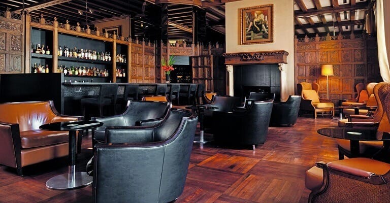 Oak Bar: An elegant yet comfortable ambience to unwind and relax for a casual meeting or after dinner drinks. A “Club Style” bar with antique oak paneling, a wood burning fireplace, brown leather wingback chairs, and a terrace overlooking the garden, ideal to enjoy signature cocktails.